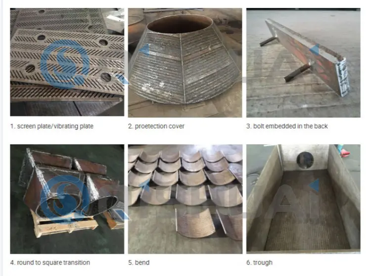 - Hlavní hřídele jednoválcových drtičů hřídele jednoválcových drtičů, překryvné svařování plátů, struskové skluzy, rozdělovací kotouče, vibrační vložky podavačů, vibrační sítové vložky, násypky na rudy, lopatky násypek a součásti odolné proti opotřebení pro dopravu vodní strusky. Účinně odolávají otěru vysokoteplotní struskou, rudou a dalšími materiály, snižují prostoje v ocelářských zařízeních a zajišťují stabilní výrobní operace.